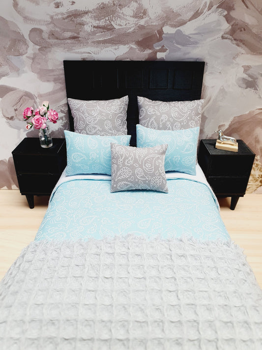 Dolls house 6 piece set, Double bedding, Blue double bedding set, 12th scale bedding, miniature bed set