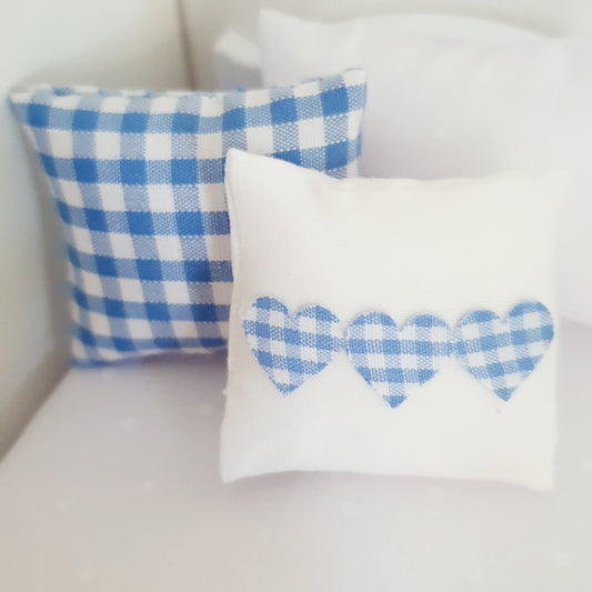Dolls house 2x cushions, 1x Blue check & 1x white with blue check Love Hearts, 12th scale cushions, miniature cushions