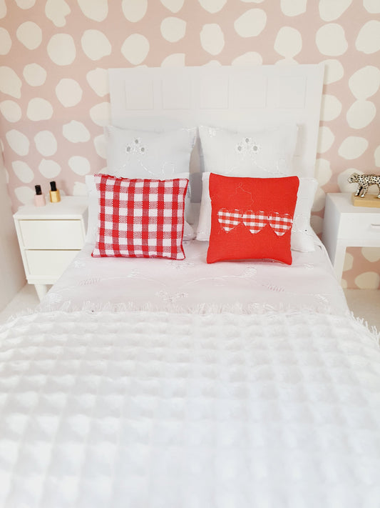 Dolls house 2x cushions, 1x Red check & 1x Red with Red check Love Hearts, 12th scale cushions, miniature cushions