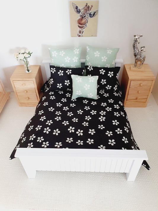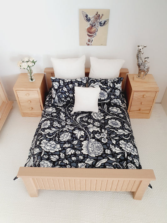 Dolls house 6 piece set, Double bedding, Black floral print, 12th scale bedding, miniature bed set (BD36)