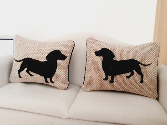Dolls house 2x cute sausage dog cushions, 12th scale cushions, miniature cushions