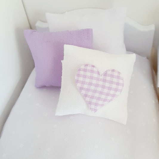 Dolls house 2x Cushions with 1x Lilac, 1x White with Lilac Checked Heart Cushion, 12th scale cushions, miniature cushions