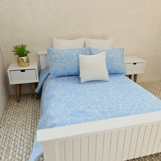 Dolls house 6 piece set, Double bedding, pretty blue flowers, 12th scale bedding, miniature bed set