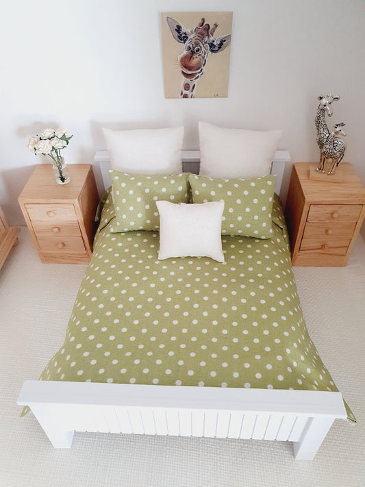Dolls house 6 piece set, Double bedding, Sage Green Polka Dot print, 12th scale bedding, miniature bed set