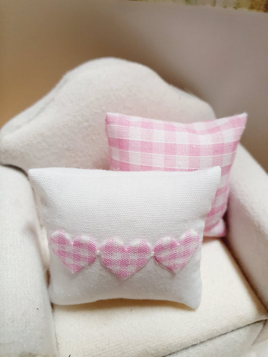 Dolls house 2x cushions, 1x Pink check & 1x white with pink check Love Hearts, 12th scale cushions, miniature cushions