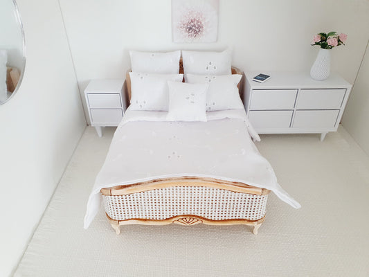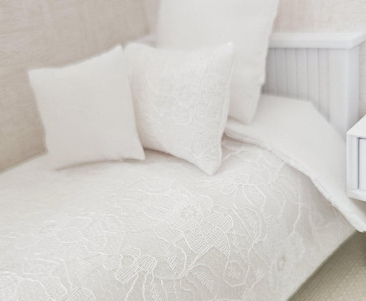 Dolls House White Lace Single bedding 4 Piece Set, 12th scale bedding, miniature bed set