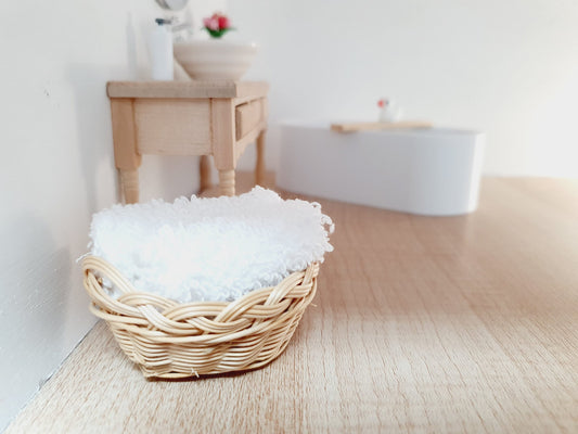 Dolls House Wicker Towel Basket with 3 Rolled up Towels and a cute little duck, 1:12th Scale, Miniature