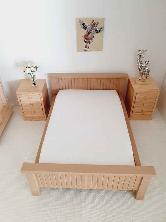 Dolls House Wooden Double Bed 1:12th Scale, Miniature Bed with Mattress (BRWB)