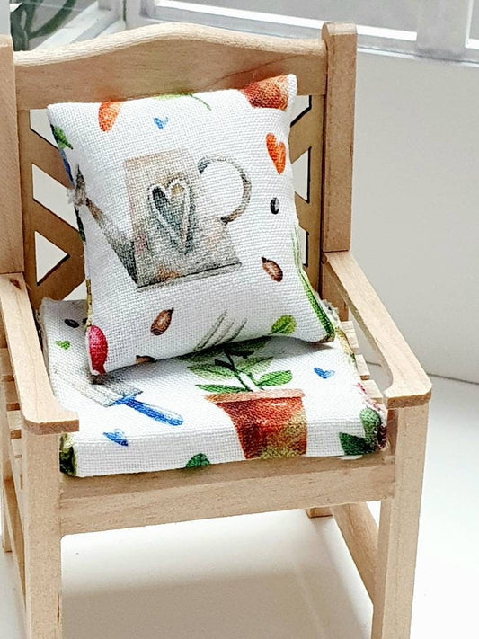Dolls House Wooden Garden Bench with Garden Theme Cushion, Miniature, 12th Scale
