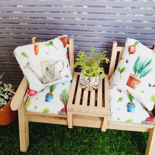 Dolls House Wooden Garden Bench and 1x Chair with 1x Side Table, 1x Long Table with Seat Pad in Garden Theme Cushions, Miniature, 12th Scale