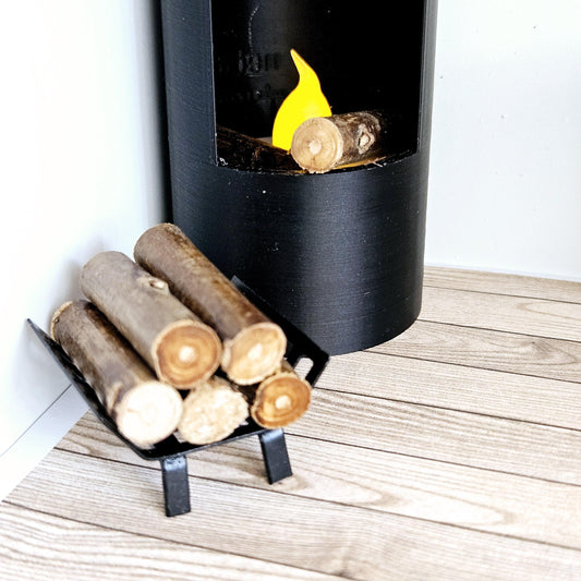 Dolls House Black Log Holder With Wood, 12th Scale, Miniature logs