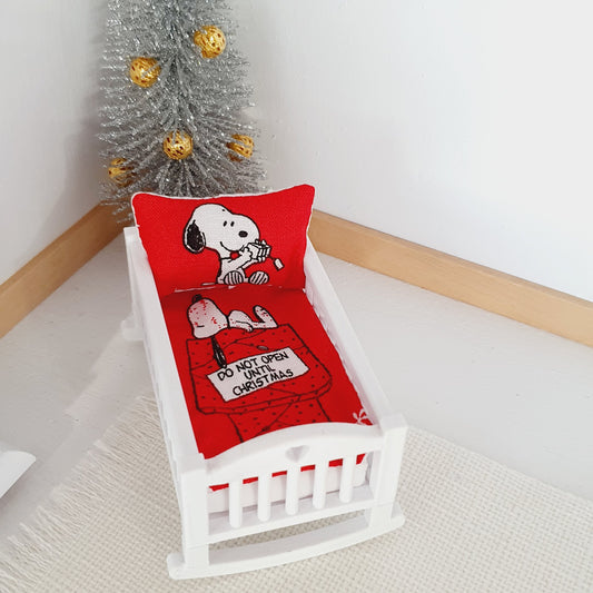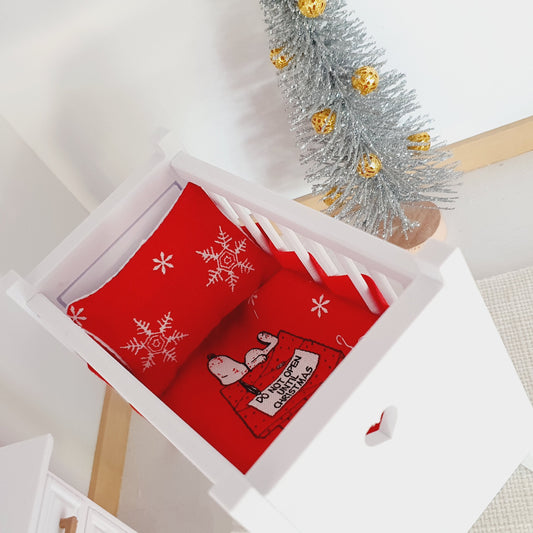 Dolls House Christmas Cot Bedding Set – Cute Snoopy Theme, Handmade in England, 1:12 Scale
