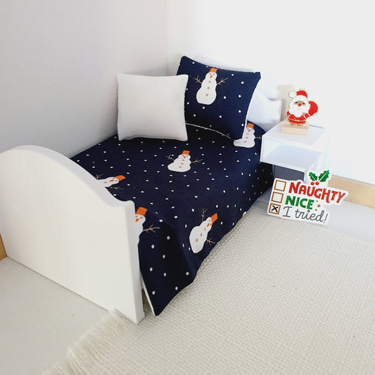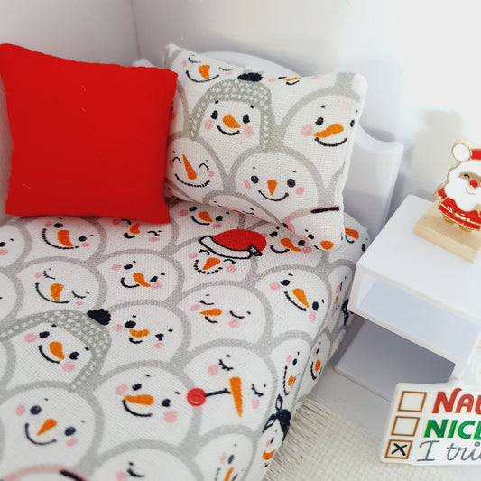 Dolls House Christmas Junior Bedding Set – Snowman & Snowflakes, Handmade in England, 1:12 Scale