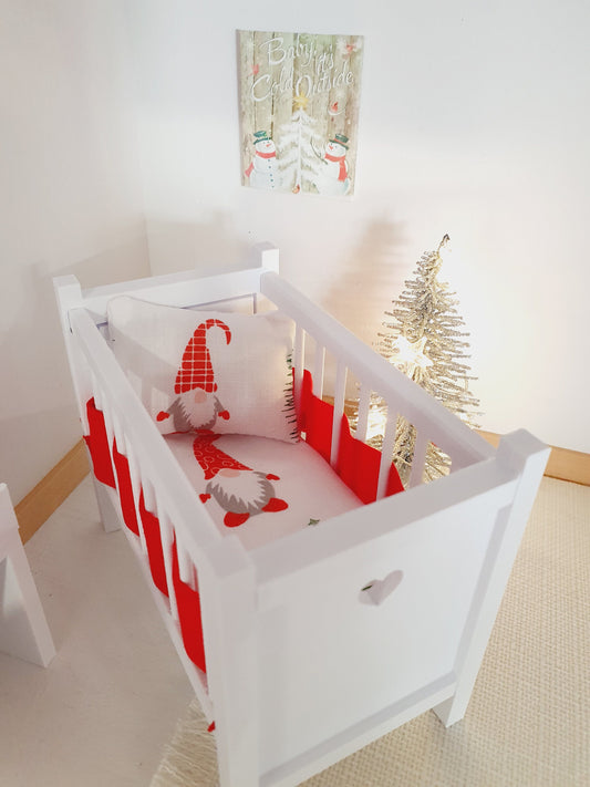 Dolls House Christmas Cot Bedding Set – Gnome Theme, Fun & Colourful, Handmade in England, 1:12 Scale