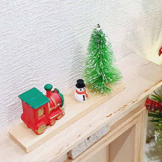Dolls House Christmas Ornament, Green Christmas Tree & a Tiny Snowman, Little Train on a Stand, 1:12th Scale, Miniature Christmas Ornament