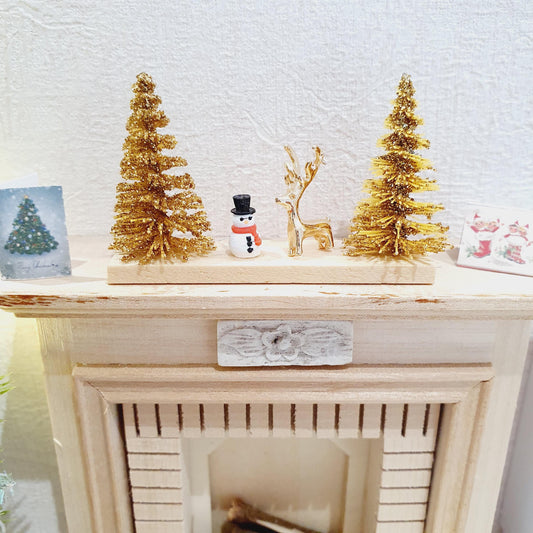 Dolls House Christmas Ornament, Gold Christmas Trees & a Tiny Snowman, Gold Reindeer on a Stand, 1:12th Scale, Miniature Christmas Ornament