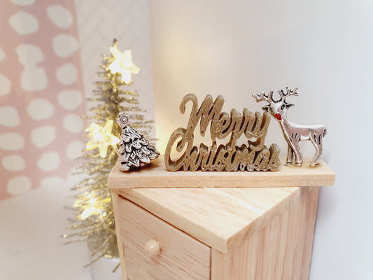 Dolls House Christmas Ornament, Merry Christmas on a Stand with a Reindeer & Christmas Tree, 1:12th Scale, Miniature Christmas Ornament