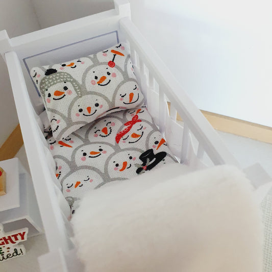 Dolls House Christmas Cot Bedding Set – Snowman Collage Theme, Handmade in England, 1:12 Scale