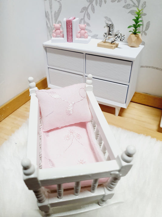 Dolls House Crib Bedding – Pink Floral Leaf Design, Handmade in England, 1:12 Scale