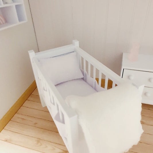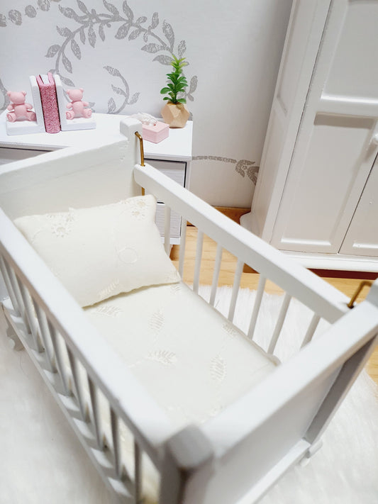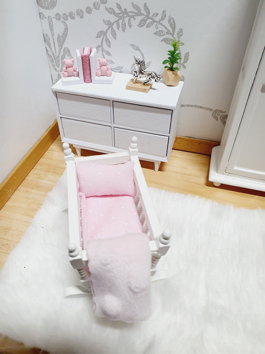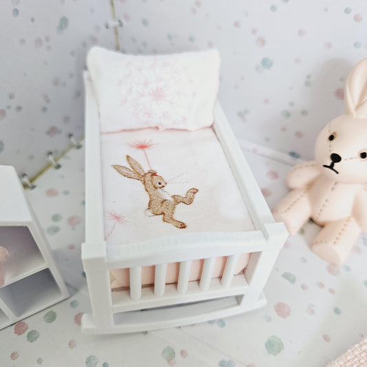 Dolls House Crib Bedding Set – Cute Rabbit Design, 1:12 Scale, miniature crib set