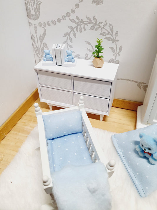 Dolls House Crib Bedding Set – Blue Polka Dot Design, Handmade in England, 1:12 Scale