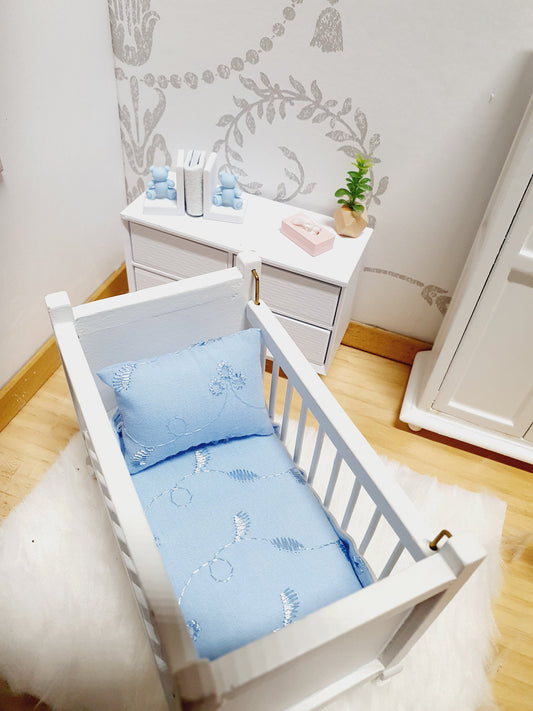 Dolls House Cot Bedding Set – Blue Raised Floral Design, Handmade in England, 1:12 Scale