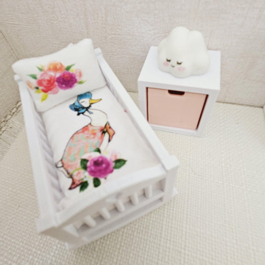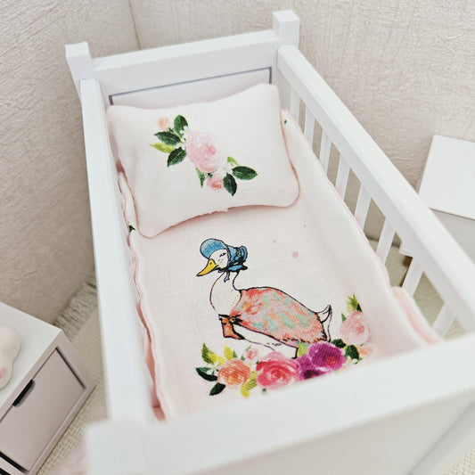 Dolls House Cot Bedding Set – Jemima Puddle Duck Design, Handmade in England, 1:12 Scale