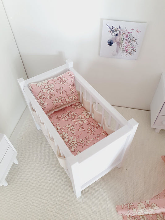 Dolls House Cot Bedding Set – Pink Capel & Cream Bumpers, Handmade in England, 1:12 Scale