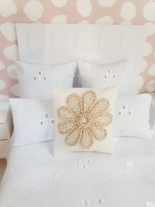 Dolls house Cream Cushion with Hessian and Gold Glitter Flower , 12th scale cushions, miniature cushion
