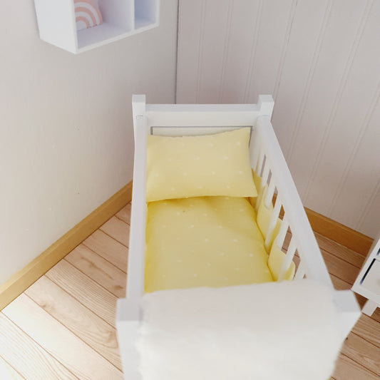 Dolls House Cot Bedding Set – Yellow Polka Dot Design, Handmade in England, 1:12 Scale