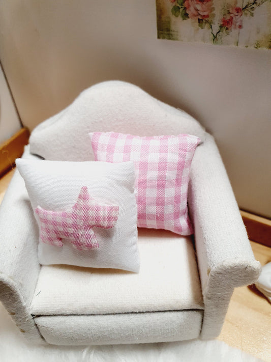 Dolls house Cushion Pair | Scottie Dog Pink Check Cushions | 12th scale cushions, miniature cushions