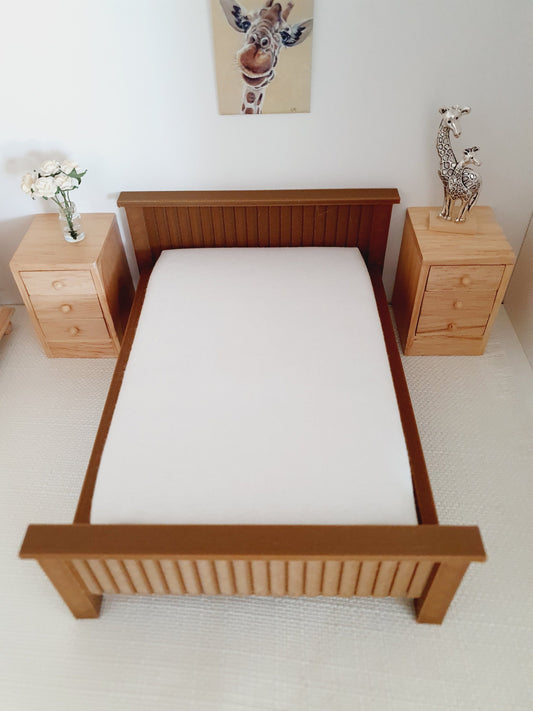 Dolls House Wooden Effect Double Bed 1:12th Scale, Miniature Bed with White Mattress