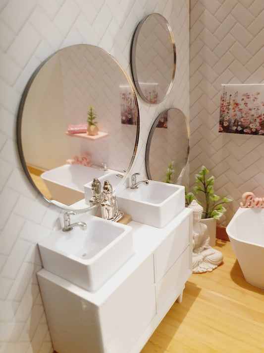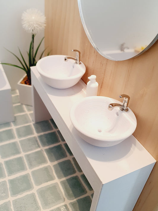 Dolls House Modern Bathroom Vanity Unit with 2x Square or Round Sinks, Choice of Colours 1:12th Scale, Miniature Sink