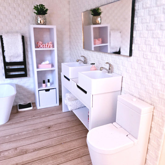 Transform your dolls house with our exclusive collection of modern bathroom accessories. Featuring miniature bathtubs, sinks, toilets, and showers, every piece is expertly designed for contemporary elegance.