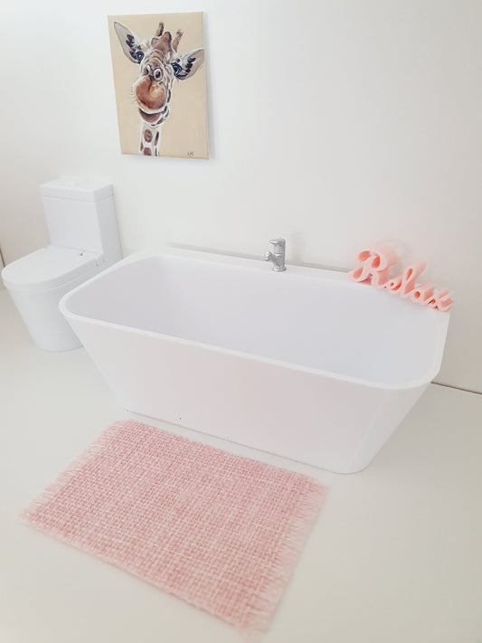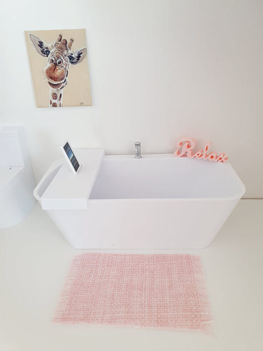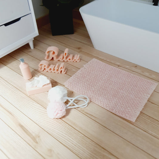 Dolls House Bathroom Accessories, Bath & Relax word, Soap pump. 2x Shower puffs, tissue box, bath mat, 12th scale, choice of colours