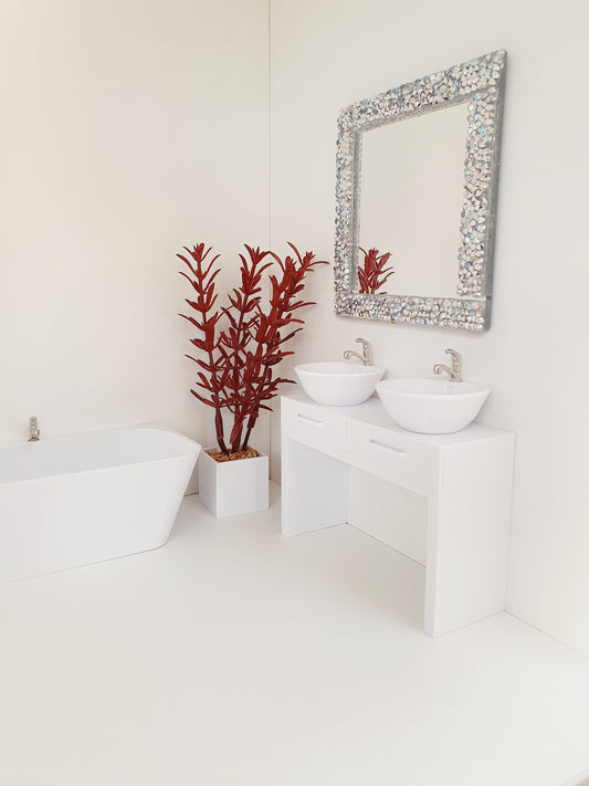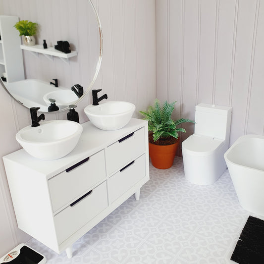 Dolls House Modern Full Bathroom Set, Bath, Vanity with double sinks, Toilet, Mirror & Soap Pump, 1:12th scale, miniature set