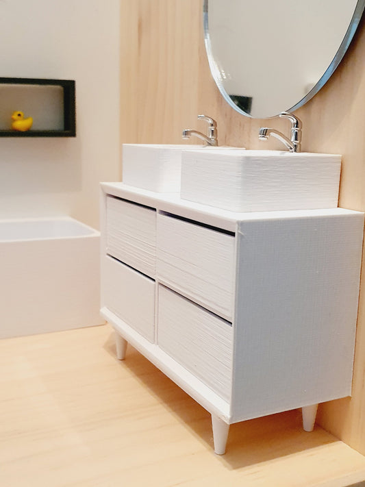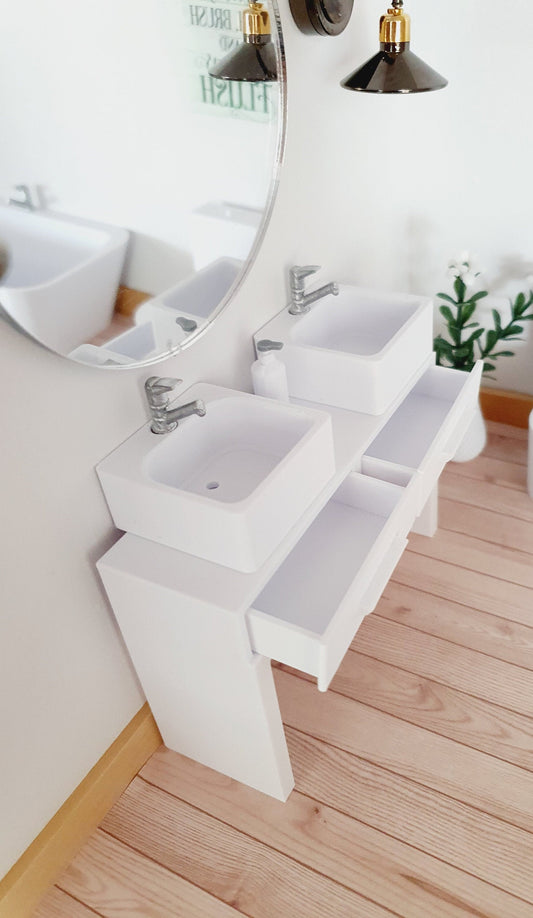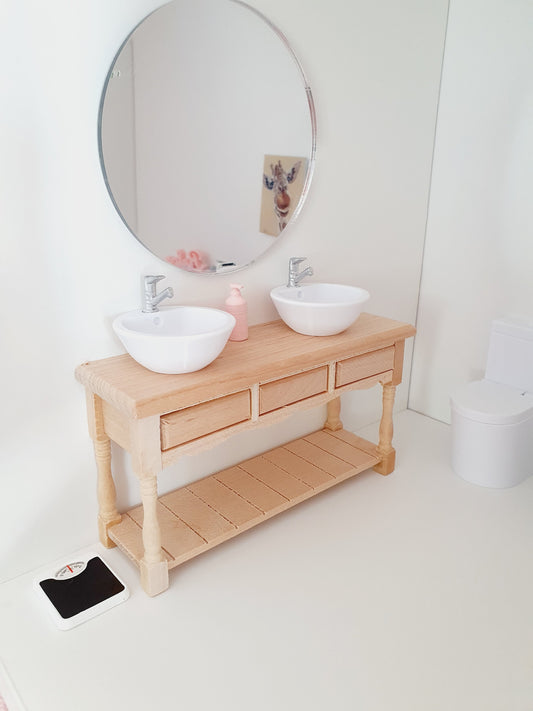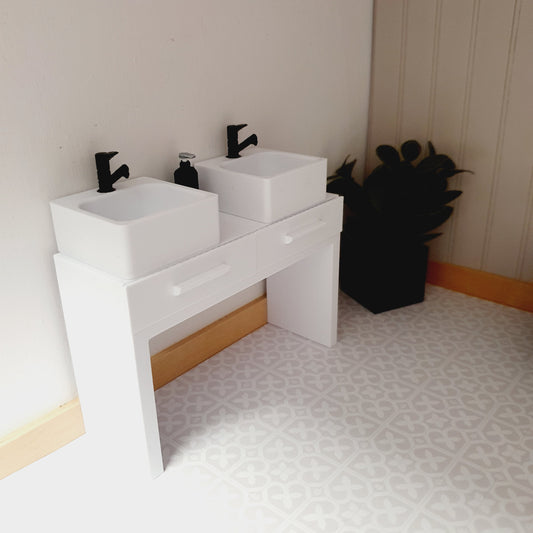 Dolls House Modern Vanity with 2x Opening Drawers, with a bottom shelf with 2x sinks, 12th Scale, Miniature