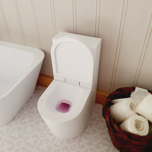 Dollhouse White Modern Toilet With Working Hinged Toilet Lid and Pink Toilet cleaner, 12th Scale, Miniature Toilet, Miniature Bathroom