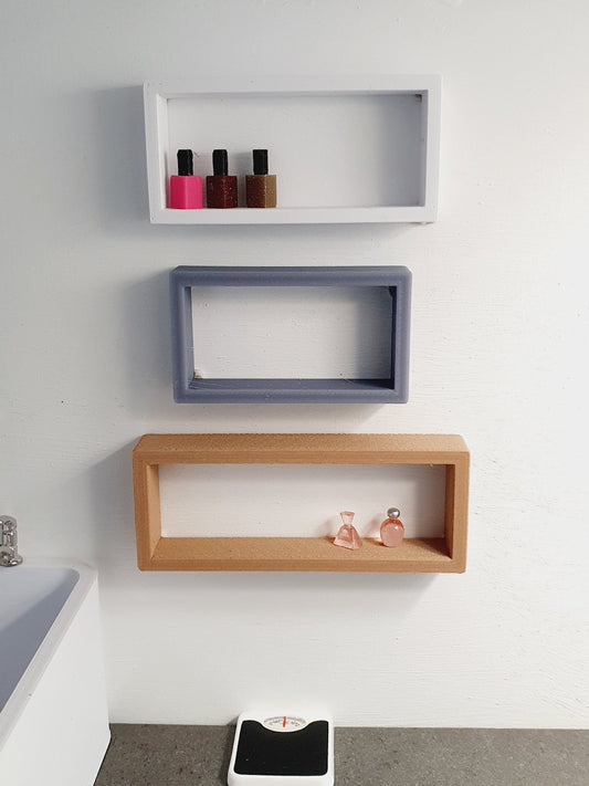 Dolls House Modern Wall Shelves | Set of 3 | White, Light Grey & Wood Effect | 1:12 Scale Miniature