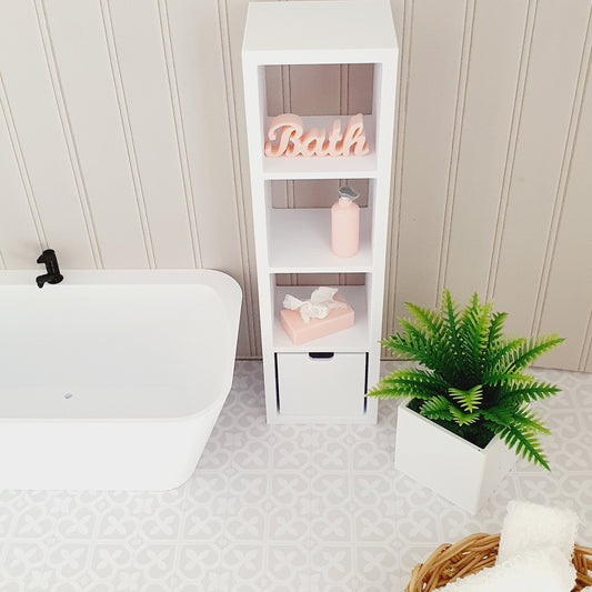 Dolls House Modern Bathroom Shelf Unit with 1 Storage Box, 1:12th Scale, Miniature shelf, Choice of Colours