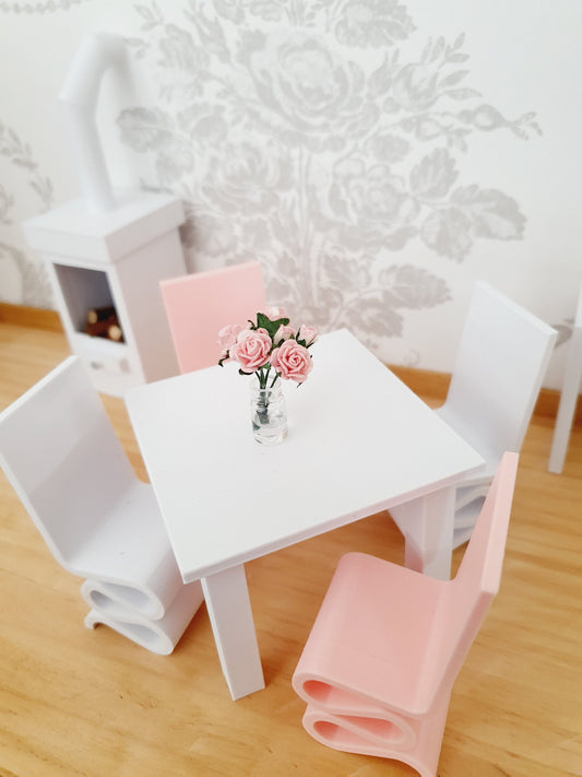 Dolls House Modern Small White Dining Table with Chunky Legs & 4 Funky Chairs 1:12th Scale, Miniature Table