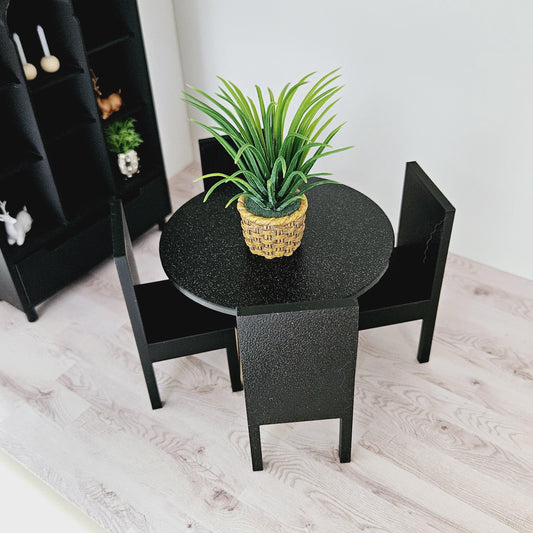 Dolls House Dining Set | Wood & Granite Effect Table with Black Chairs | 1:12 Scale
