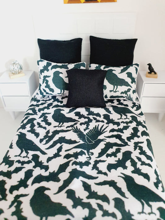 Dolls house Halloween 6 piece set, Double bedding, Black Crow print, 12th scale bedding, miniature bed set