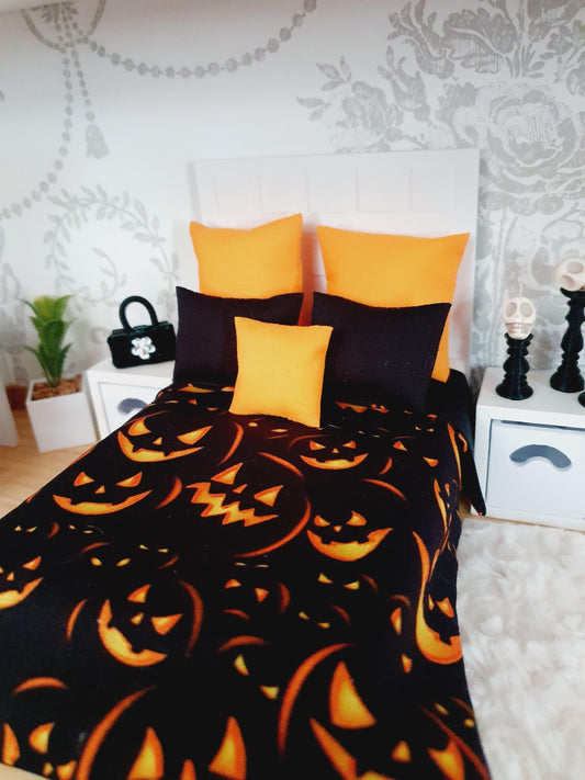 Dolls house Halloween 6 piece set, Double bedding, Black Pumpkin print, 12th scale bedding, miniature bed set