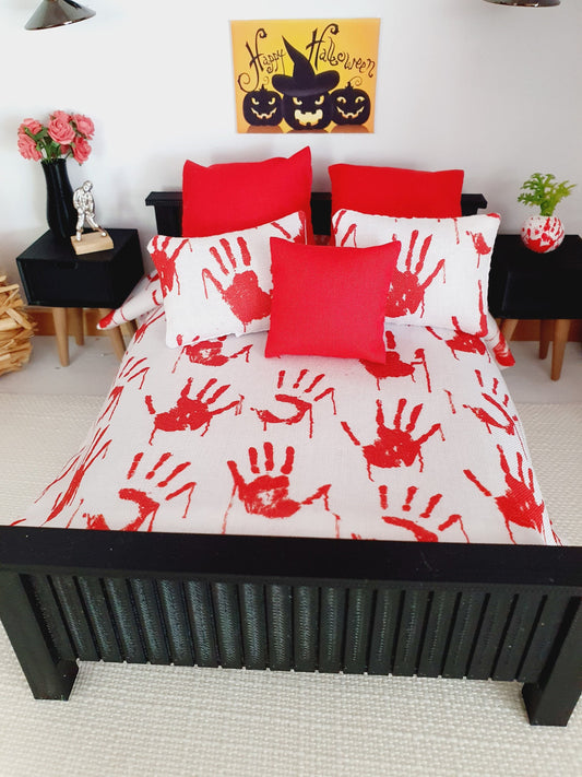 Dolls house Halloween 6 piece set, Double bedding, White with Red blood hand prints, 12th scale bedding, miniature bed set