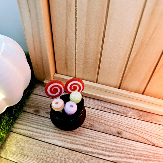 Dolls House Halloween candy in a Witches Cauldron, 5x lollipops, 12th scale, miniature candy