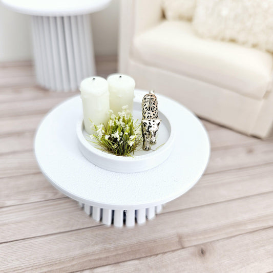 Dolls House Coloured tray ornament with 2x candles, white plant & a silver or gold leopard, 12th scale, miniature ornament