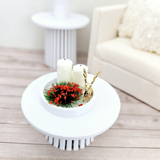 Dolls House Christmas Coloured tray ornament with 2x candles, white or red plant & a gold reindeer, 12th scale, miniature ornament