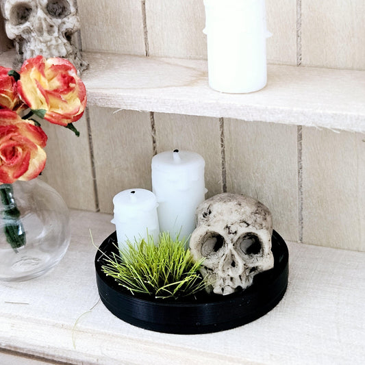 Dolls House Halloween Coloured tray ornament with 2x candles, green plant & a Skull, 12th scale, miniature Halloween ornament
