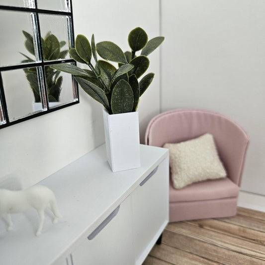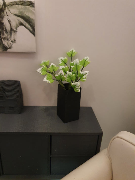 Dolls House Tall Square Vase with Green Leaves, 1:12th Scale, Miniature Plant Pot, Dollhouse Accessories